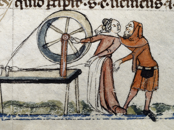 Smithfield Decretals Published December 3, 2012 at 709 × 532 in “He deflowered me in the barn …” Man accosting a woman at the loom: Smithfield Decretals, Southern France, late 13th — early 14th Century. British Library, Royal MS 10E